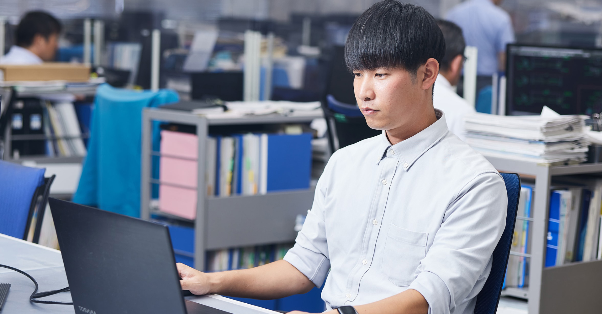 主に発電プラント設備(バイオマス設備、灰処理設備、アンモニア設備等)の電気計装関係の設計、製作、検査、現地工事、試運転調整作業に携わっています。その中の制御設計については、設備全体の制御システムの設計から、動力盤・制御盤等のハードウェア設計、ソフトウェア(制御プログラム)の開発まで一貫したエンジニアリング業務を行っています。
